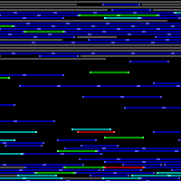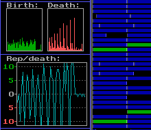 The main window represents the chunk of memory in which the self- replicating programs "live". When they allocate a block of memory to copy themselves into to make a child, that block of memory is shown as dark grey. Once the copy is complete and they turn the child loose, the child gets it's own color. If it was a perfect copy (no mutations) the child gets the color of the parent, otherwise it gets a new color. The colors are rotated on, such that all green organisms either are perfect copies of other greens or are mutant blues. Here's the color cycle: